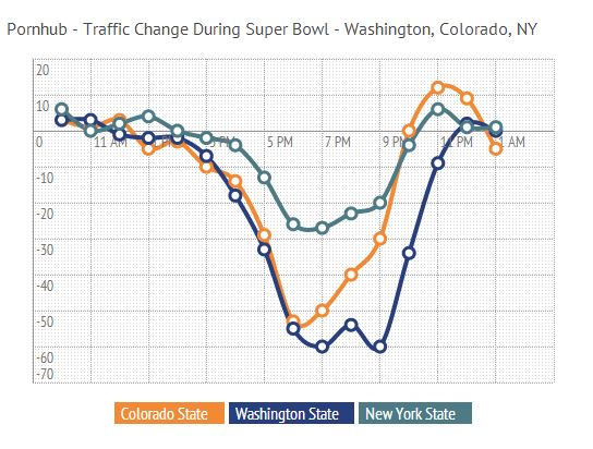 Today, PornHub.com released a post Super Bowl study that shows how the world and USA consumed porn, in relation to Denver and Seattle before, during and after the game.